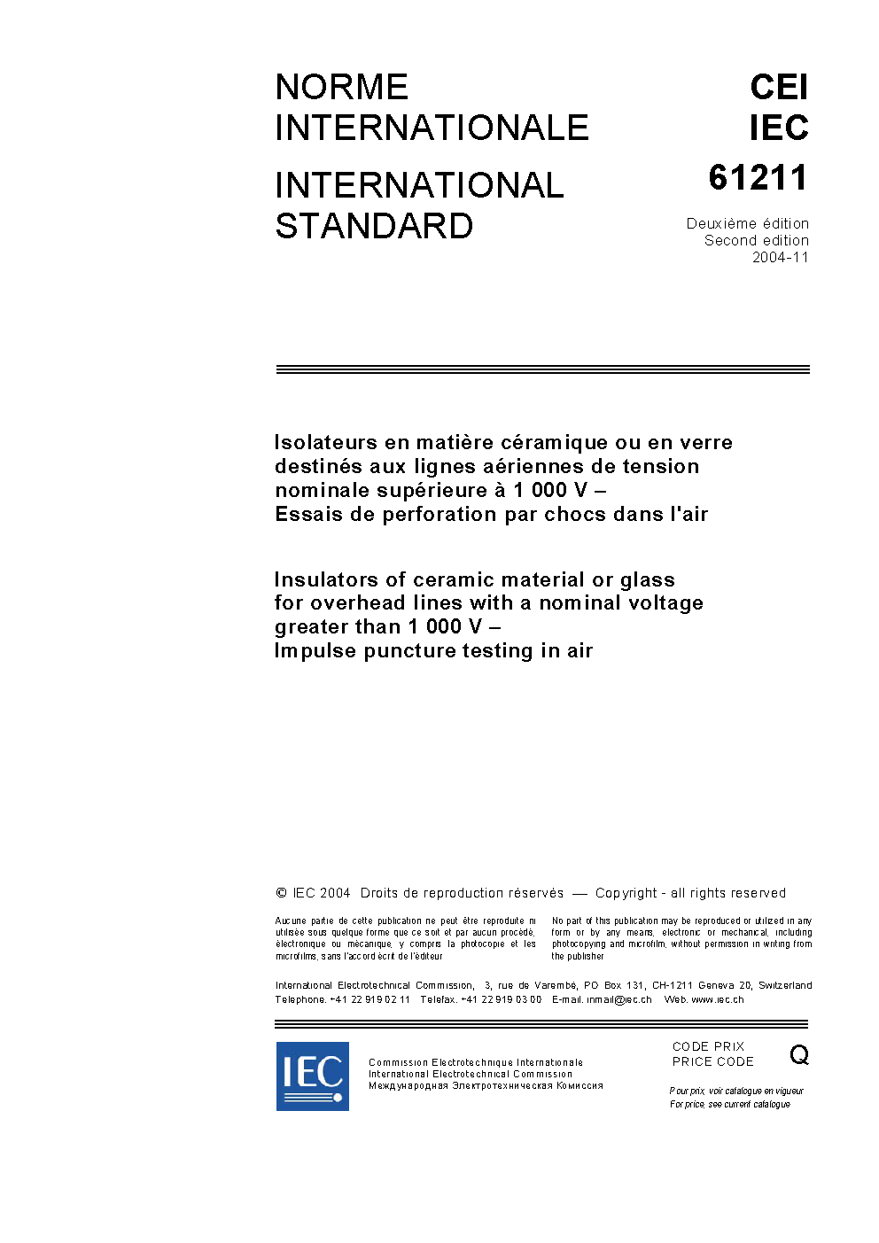 IEC 61211:2004 Insulators of ceramic material or glass for overhead lines with a nominal voltage greater than 1 000 V - Impulse puncture testing in air
