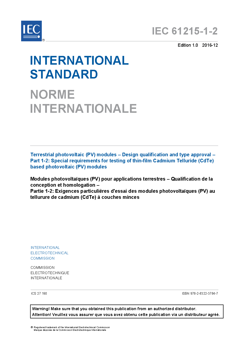 IEC 61215-1-2:2021/AMD1:2022 Amendment 1 - Terrestrial photovoltaic (PV) modules - Design qualification and type approval - Part 1-2: Special requirements for testing of thin-film Cadmium Telluride (CdTe) based photovoltaic (PV) modules