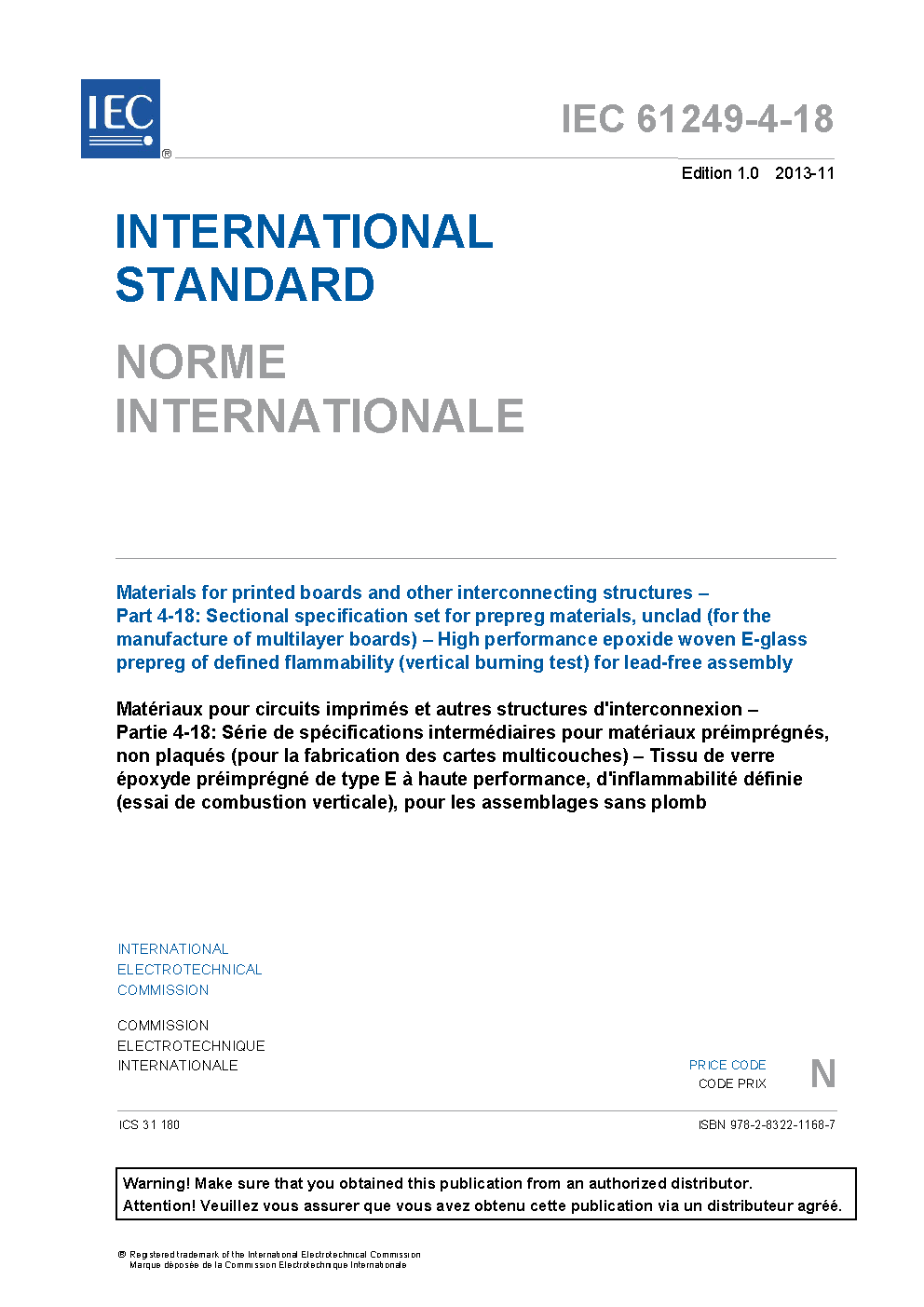 IEC 61249-4-18:2013 gives requirements for properties of prepreg that is mainly intended to be used as bonding sheets in connection with laminates according to IEC 61249-2-39 when manufacturing multilayer boards according to IEC 62326-4. Multilayer boards comprised of these materials are suitable for lead-free assembly processes. This material may be also used to bond other types of laminates. Prepreg according to this standard is of defined flammability (vertical burning test). The flammability rating on fully cured prepreg is achieved through the use of brominated fire retardants contained as an integral part of the polymeric structure. After curing of the prepreg according to the supplier's instructions, the glass transition temperature is defined to be 170 °C minimum.
