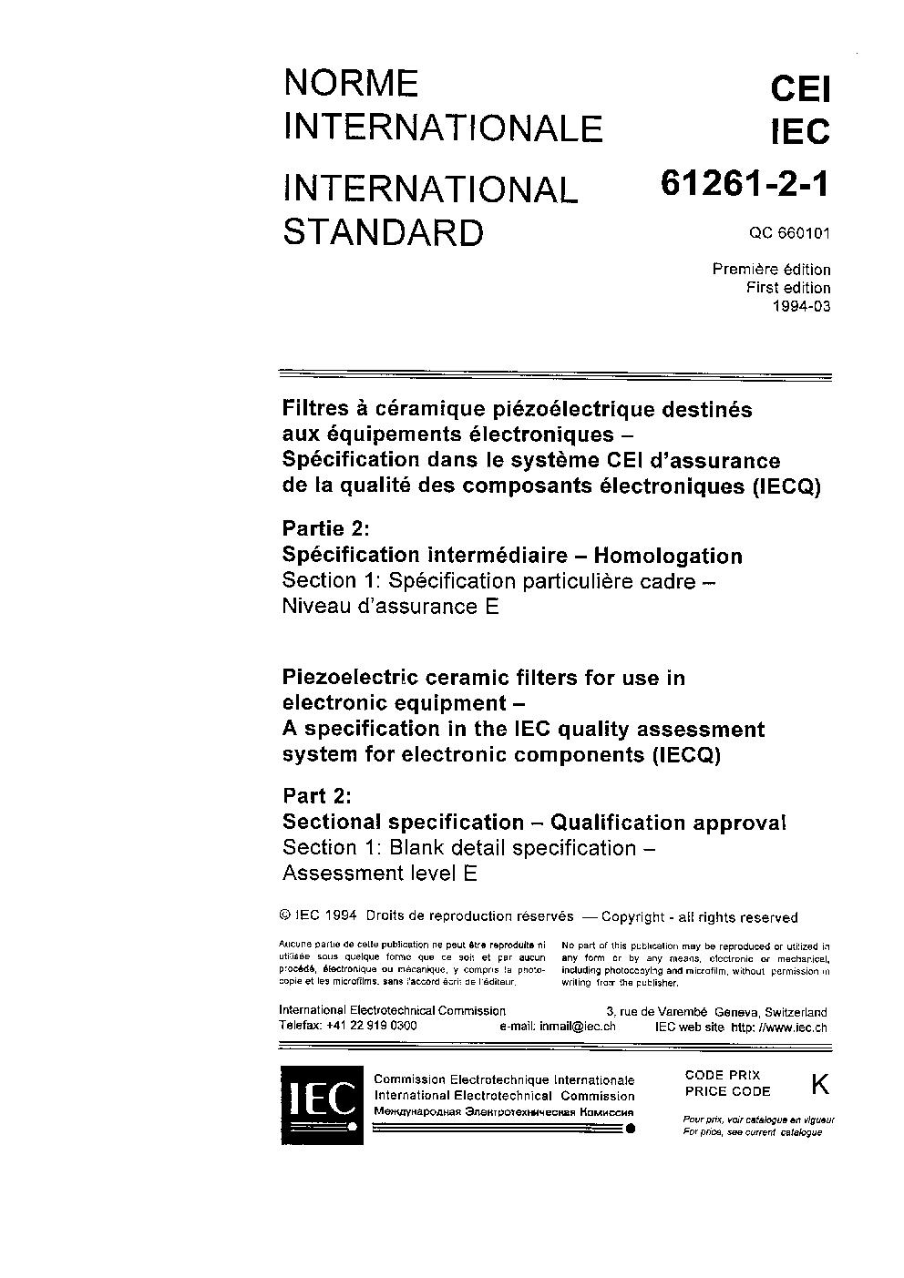 IEC 61261-2-1:1994 Piezoelectric ceramic filters for use in electronic equipment - A specification in the IEC quality assessment system for electronic components (IECQ) - Part 2: Sectional specification - Qualification approval - Section 1: Blank detail specification - Assessment level E