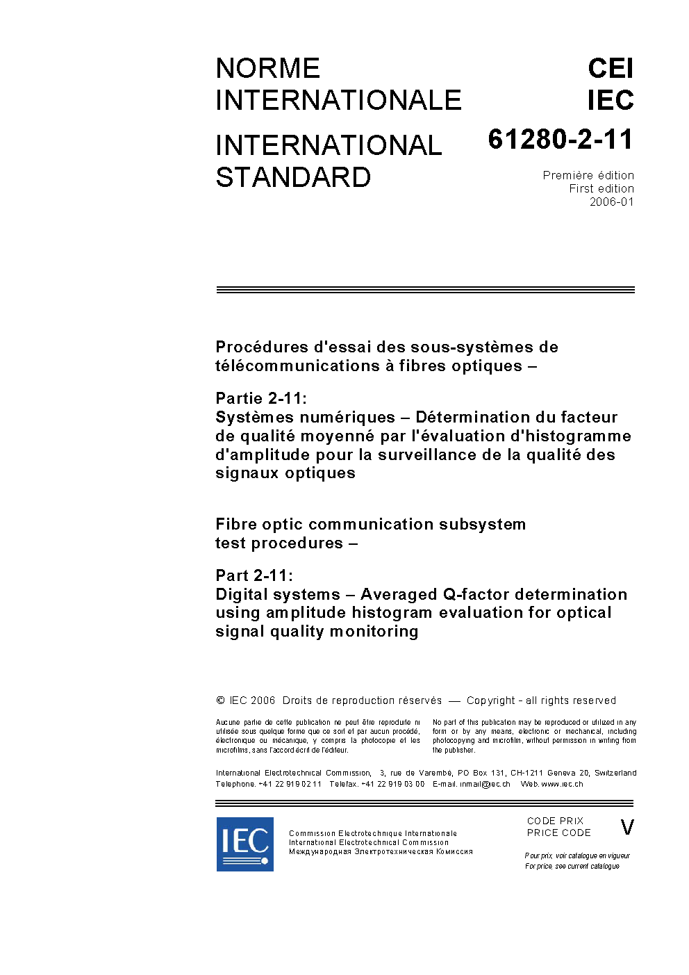 IEC 61280-2-11:2006 Fibre optic communication subsystem test procedures - Part 2-11: Digital systems - Averaged Q-factor determination using amplitude histogram evaluation for optical signal quality monitoring