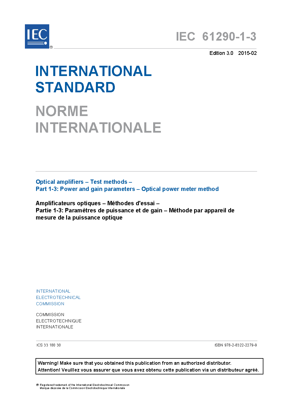 IEC 61290-1-3:2015 Optical amplifiers - Test methods - Part 1-3: Power and gain parameters - Optical power meter method