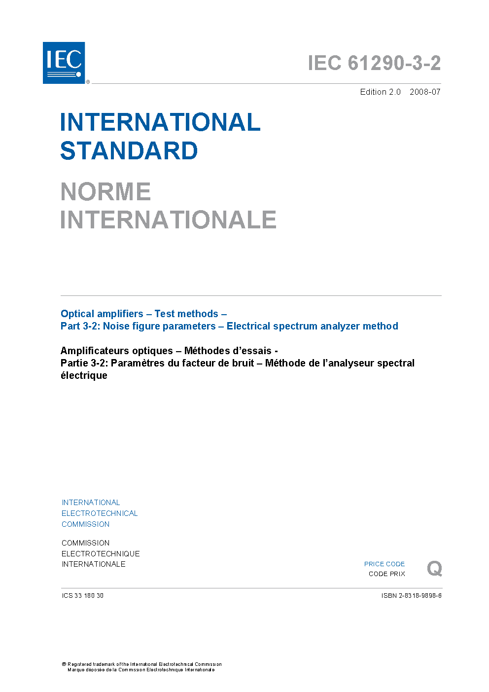 IEC 61290-3-2:2008 Optical amplifiers - Test methods - Part 3-2: Noise figure parameters - Electrical spectrum analyzer method