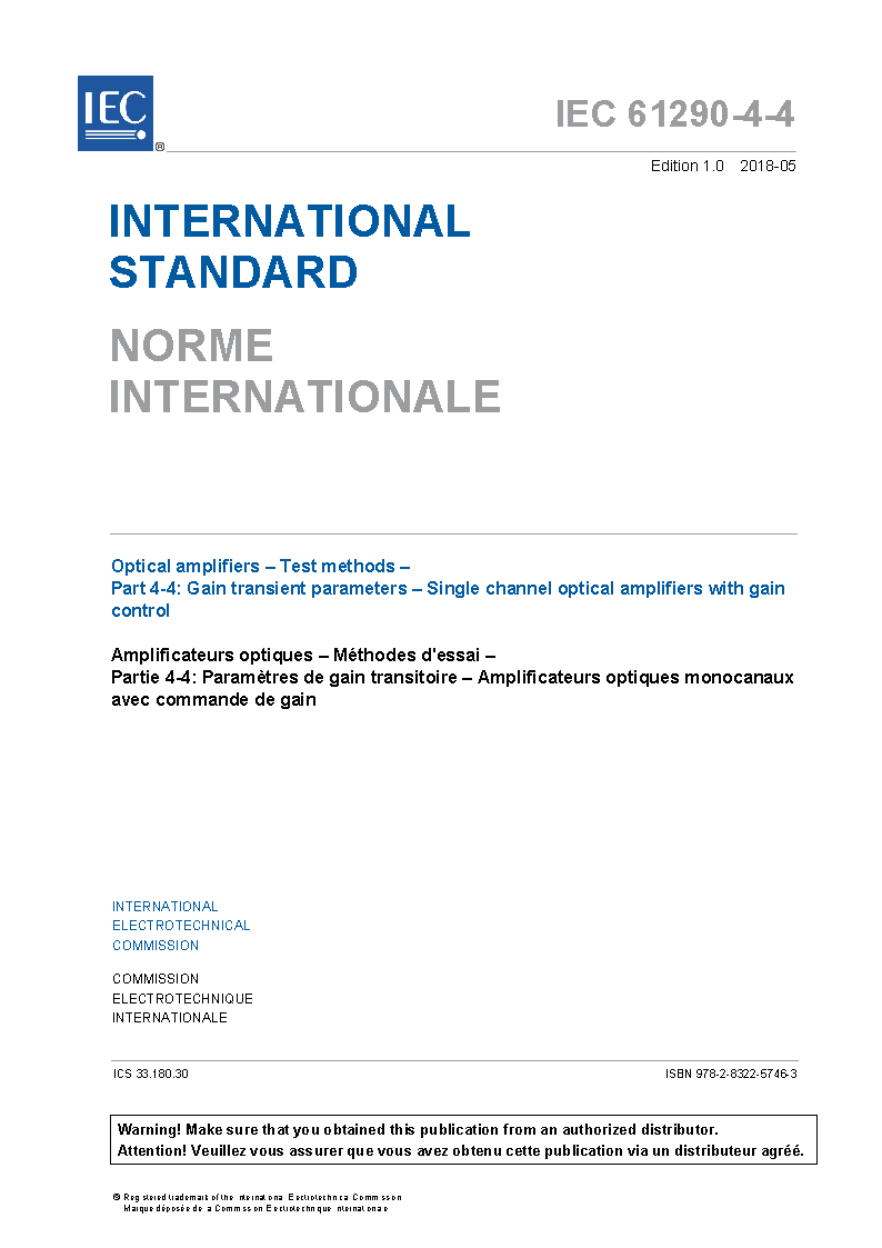 IEC 61290-4-4:2018 Optical amplifiers - Test methods - Part 4-4: Gain transient parameters - Single channel optical amplifiers with gain control