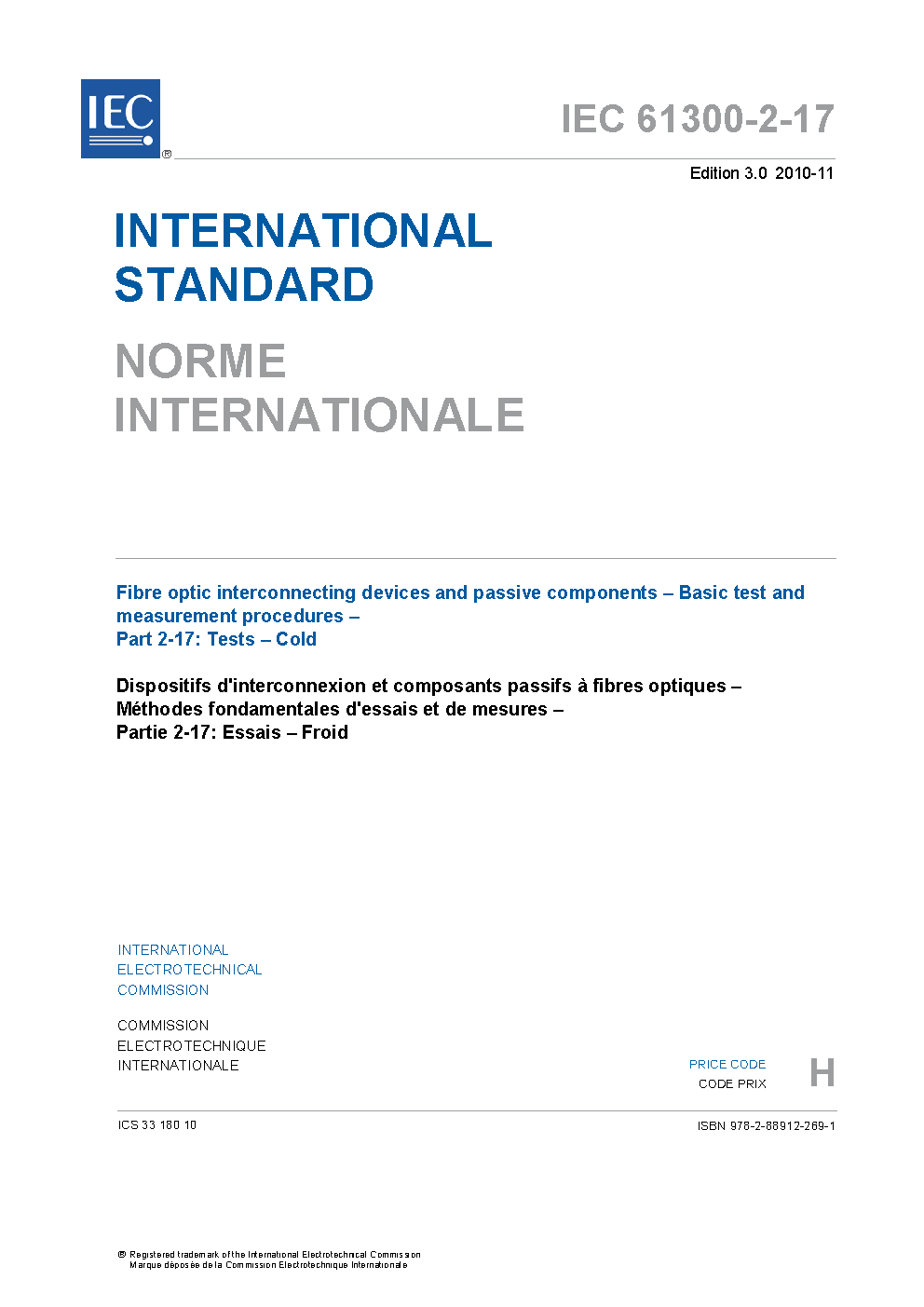 IEC 61300-2-17:2010 details a procedure for determining the suitability of a fibre optic device to withstand environmental conditions of extended low temperature (cold), which may occur in use, storage and/or transport. This procedure does not assess the ability of a device to operate during temperature variations; in this case, IEC 61300-2-22 would be used. The main changes with respect to the previous edition are: