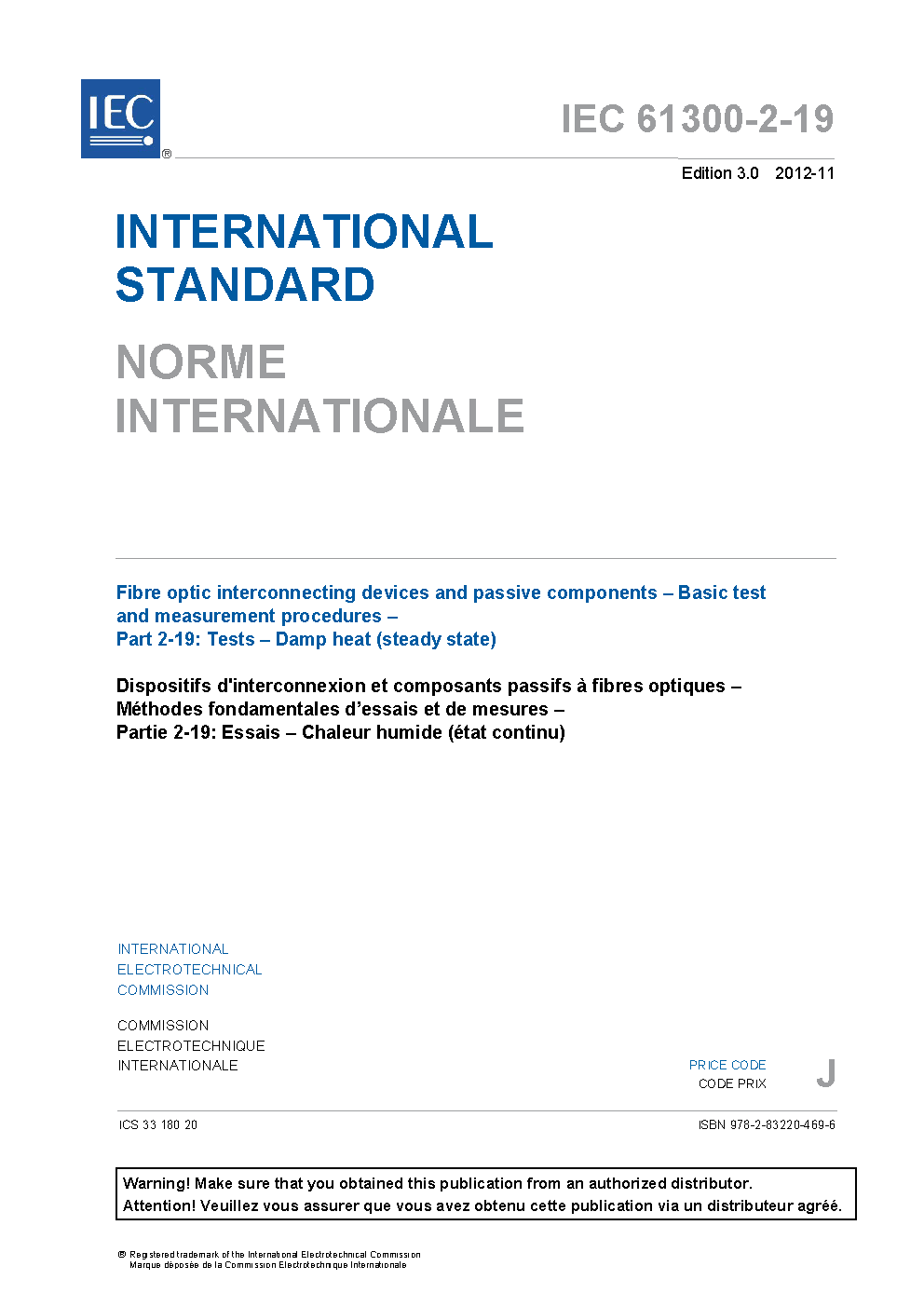IEC 61300-2-19:2012 details a procedure for determining the suitability of a fibre optic device to withstand the environmental condition of high humidity and high temperature which may occur in actual use, storage and/or transport. The test is primarily intended to permit the observation of effects of high humidity at constant temperature over a given period. This third edition cancels and replaces the second edition published in 2005. It constitutes a technical revision. The changes with respect to the previous edition are to reconsider the severities and details to be specified. Keywords: high humidity and temperature, environmental condition
