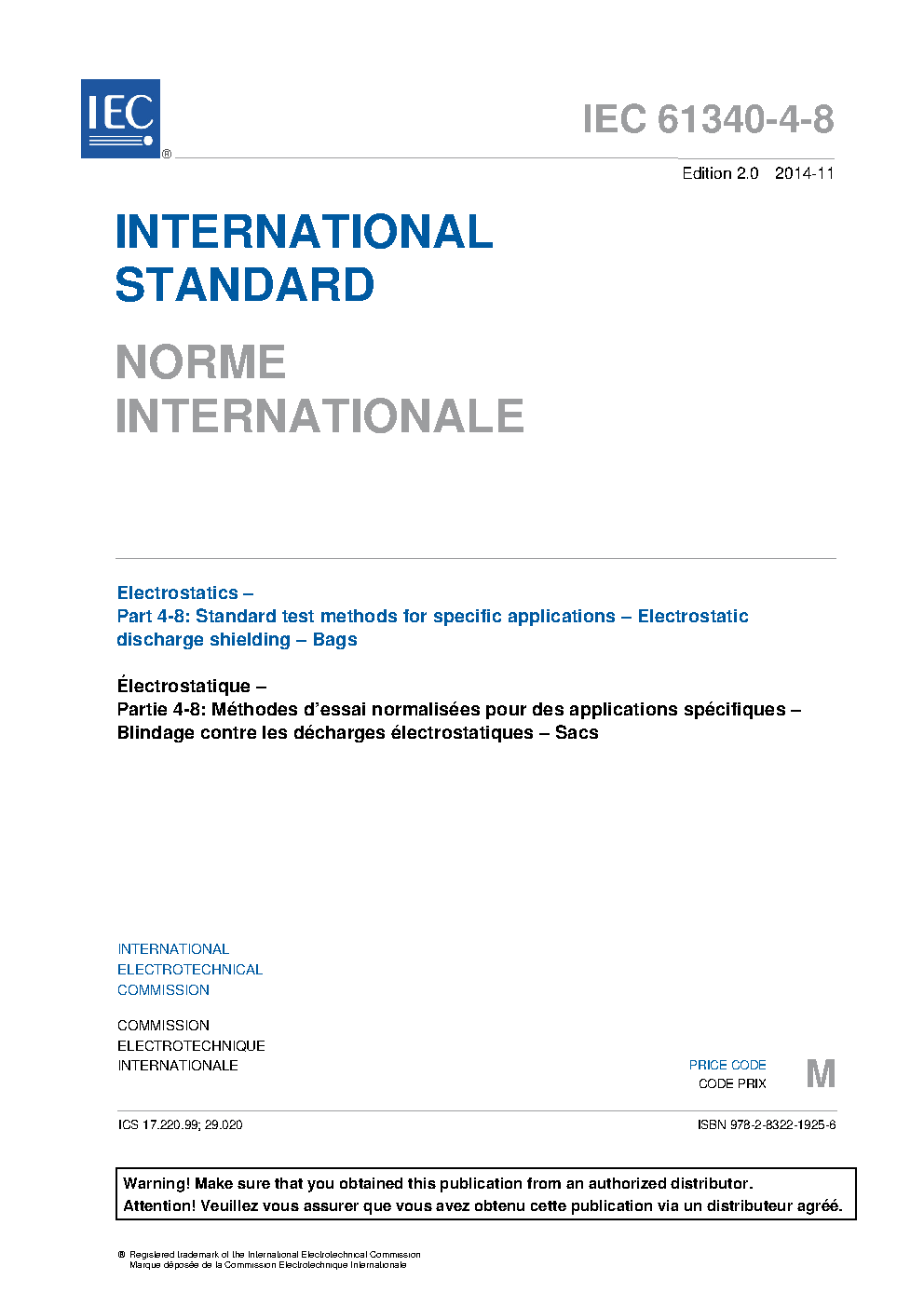 IEC 61340-4-8:2014 Electrostatics - Part 4-8: Standard test methods for specific applications - Electrostatic discharge shielding - Bags