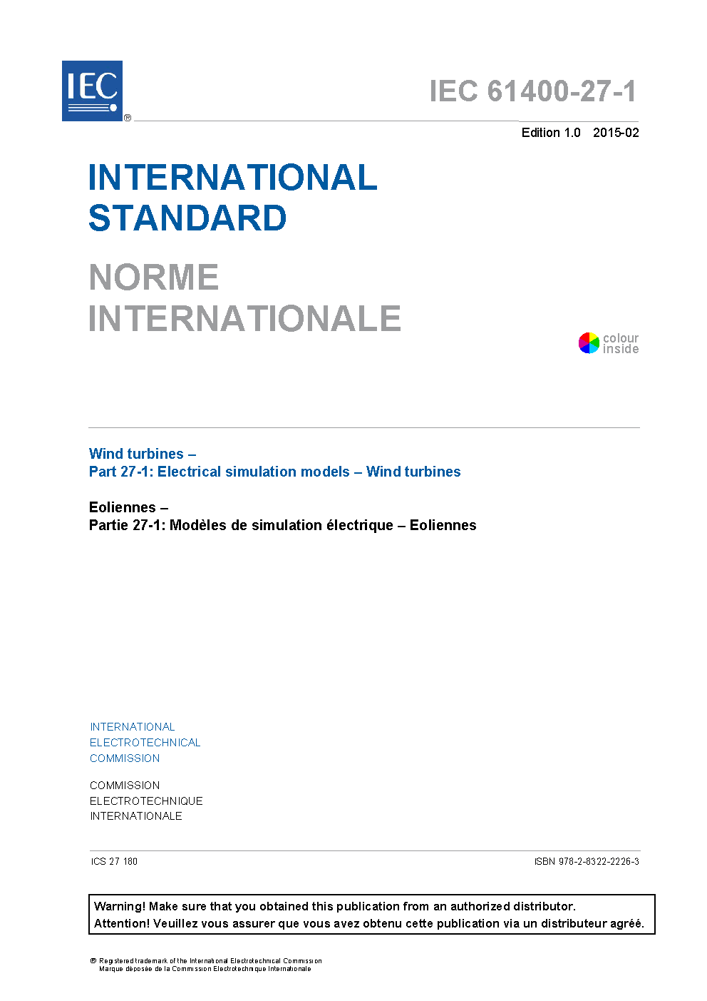 IEC 61400-27-1:2015 Wind turbines - Part 27-1: Electrical simulation models - Wind turbines