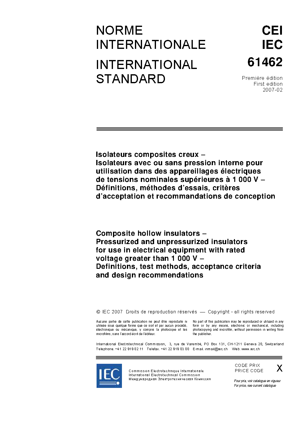 IEC 61462:2023 Composite hollow insulators - Pressurized and unpressurized insulators for use in electrical equipment with AC rated voltage greater than 1 000 V AC and D.C. voltage greater than 1500V - Definitions, test methods, acceptance criteria and design recommendations