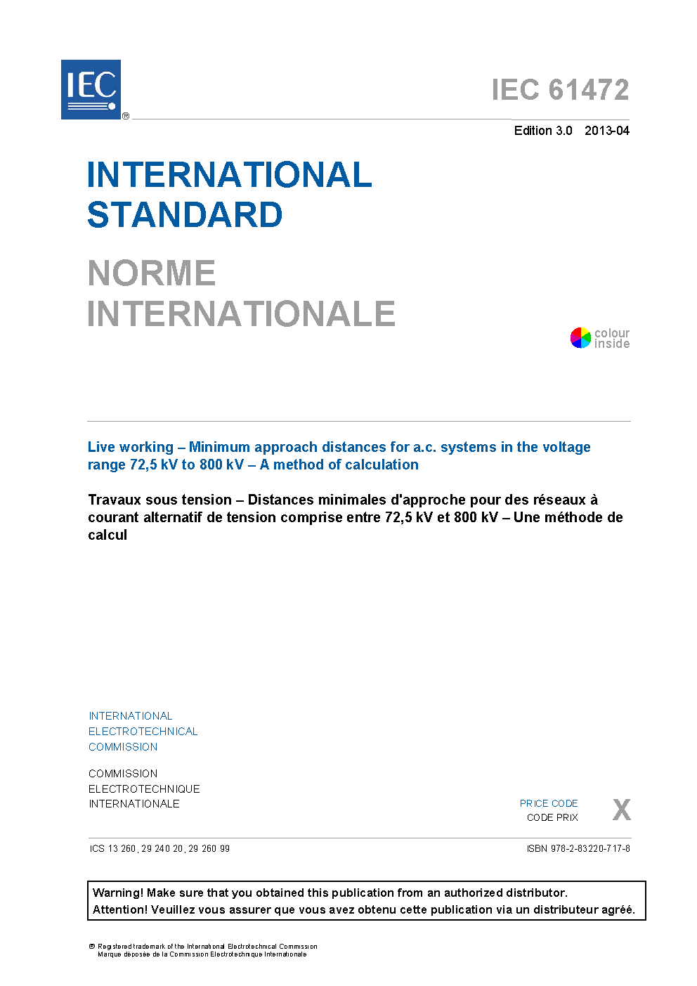 IEC 61472:2013 Live working - Minimum approach distances for a.c. systems in the voltage range 72,5 kV to 800 kV - A method of calculation
