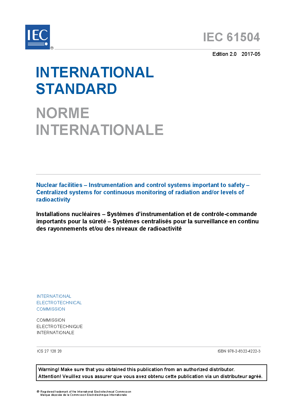 IEC 61504:2017 Nuclear facilities - Instrumentation and control systems important to safety - Centralized systems for continuous monitoring of radiation and/or levels of radioactivity