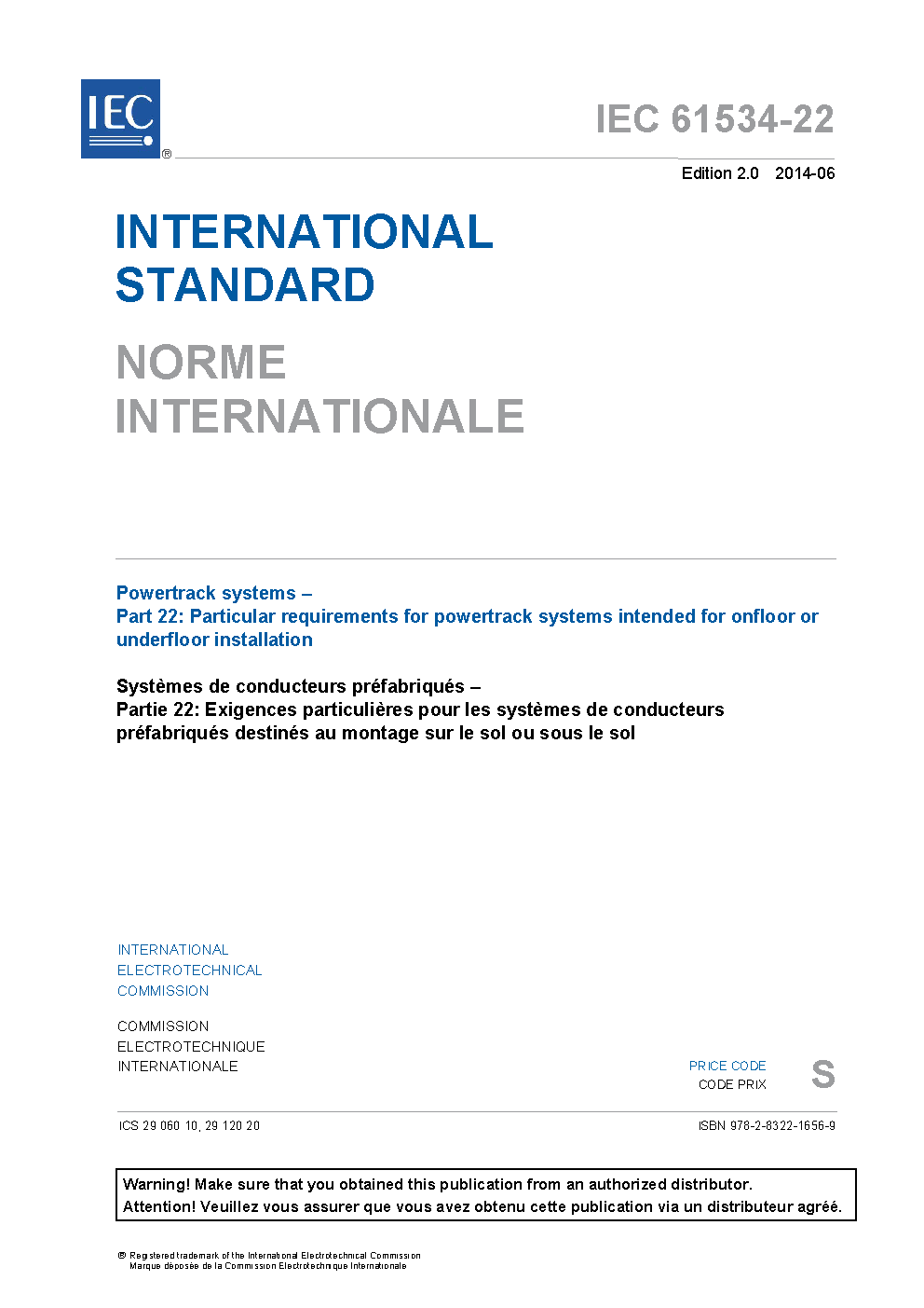 IEC 61534-22:2014 Powertrack systems - Part 22: Particular requirements for powertrack systems intended for onfloor or underfloor installation