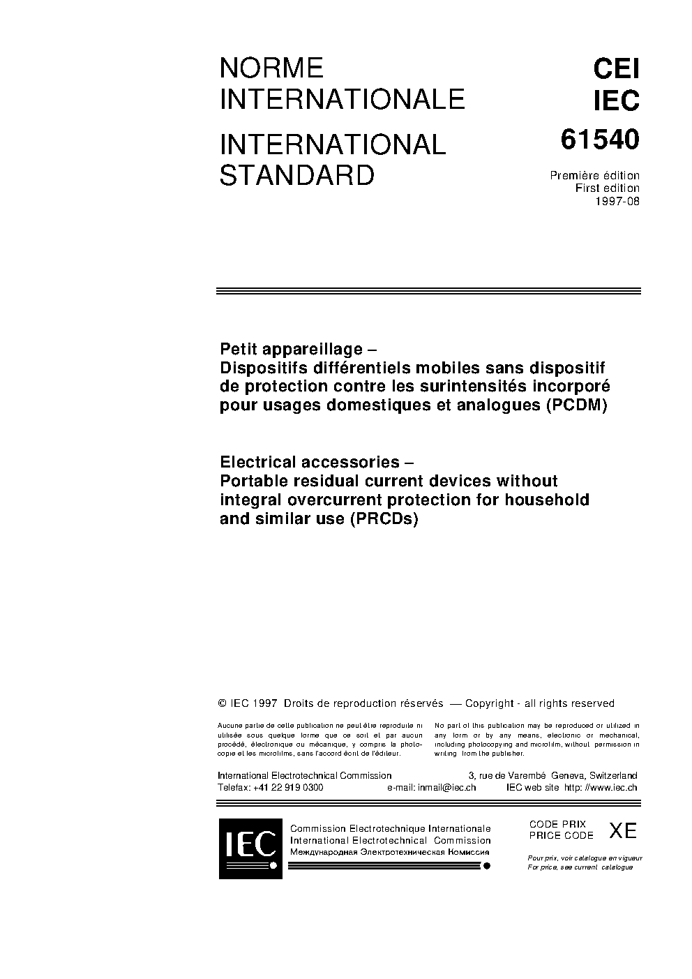 IEC 61540:1997 Electrical accessories - Portable residual current devices without integral overcurrent protection for household and similar use (PRCDs)