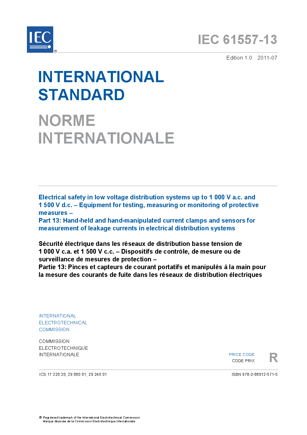 IEC 61557-13:2011 Electrical safety in low voltage distribution systems up to 1 000 V a.c. and 1 500 V d.c. - Equipment for testing, measuring or monitoring of protective measures - Part 13: Hand-held and hand-manipulated current clamps and sensors for measurement of leakage currents in electrical distribution systems