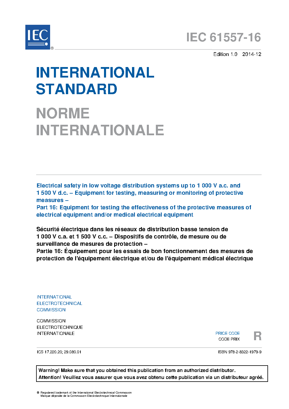 IEC 61557-16:2014 Electrical safety in low voltage distribution systems up to 1 000 V a.c. and 1 500 V d.c - Equipment for testing, measuring or monitoring of protective measures - Part 16: Equipment for testing the effectiveness of the protective measures of electrical equipment and/or medical electrical equipment