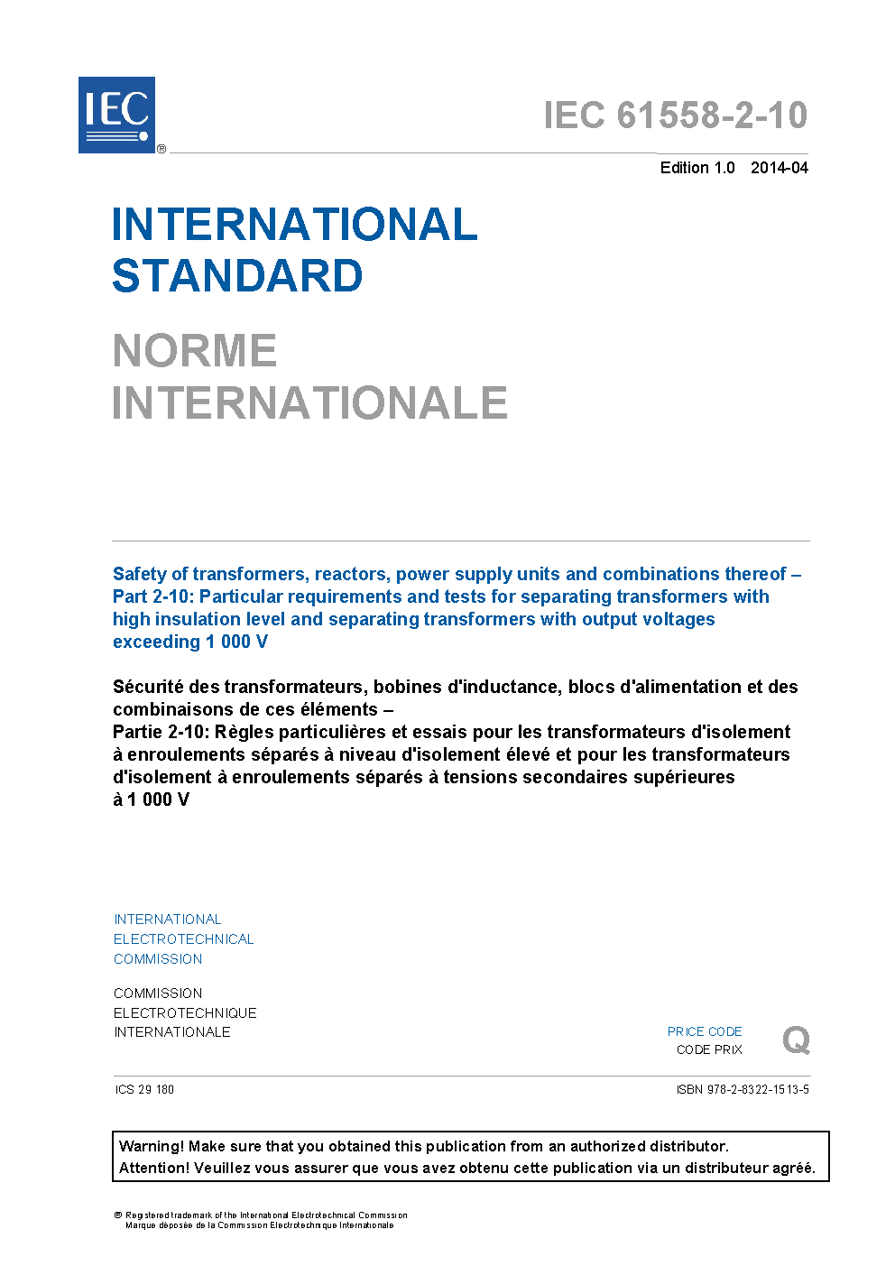 IEC 61558-2-10:2014 Safety of transformers, reactors, power supply units and combinations thereof - Part 2-10: Particular requirements and tests for separating transformers with high insulation level and separating transformers with output voltages exceeding 1 000 V