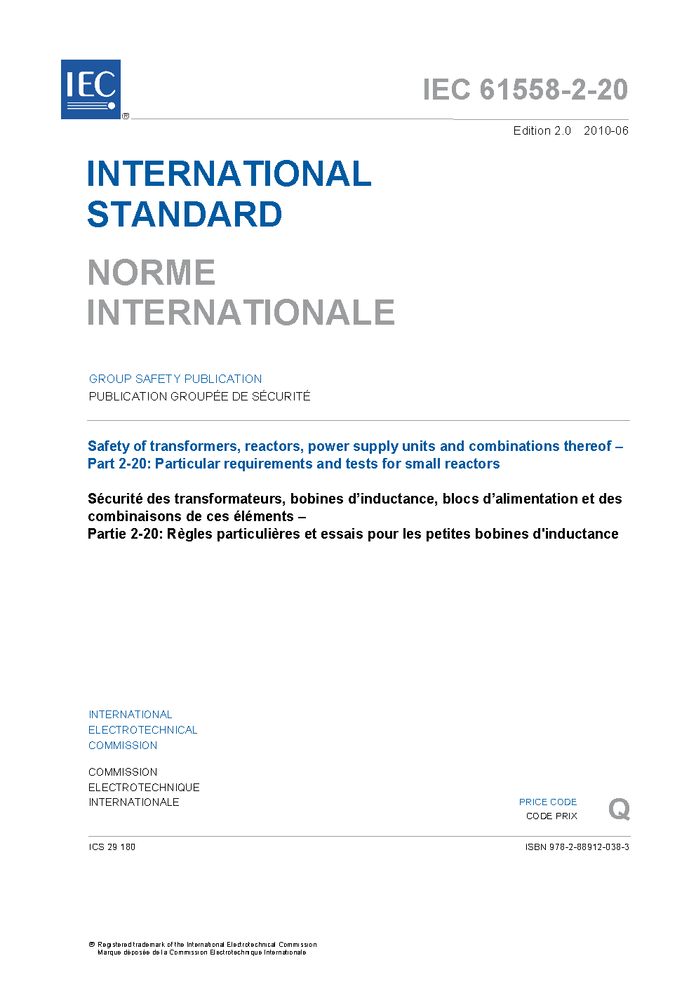 IEC 61558-2-20:2022 Safety of transformers, reactors, power supply units and combinations thereof - Part 2-20: Particular requirements and tests for small reactors