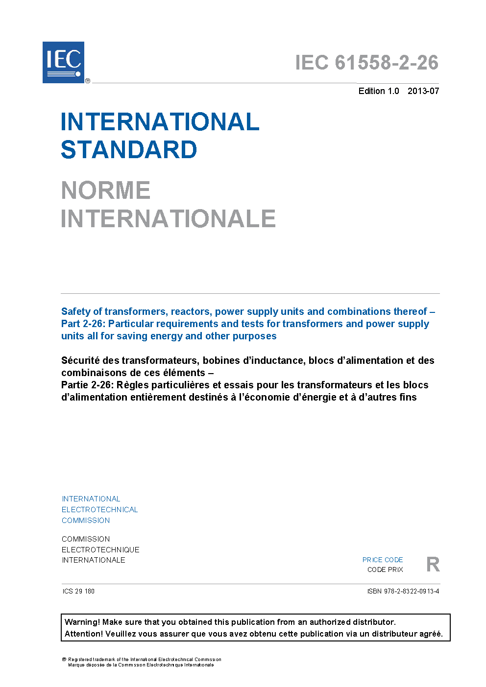 IEC 61558-2-26:2013 Safety of transformers, reactors, power supply units and combinations thereof - Part 2-26: Particular requirements and tests for transformers and power supply units all for saving energy and other purposes