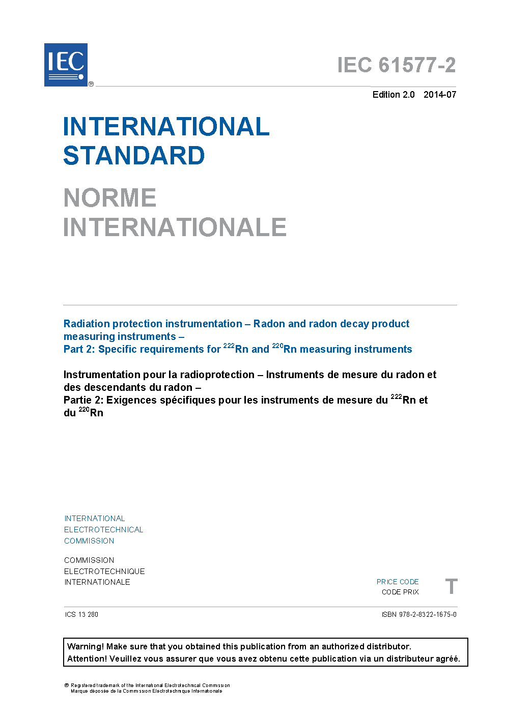 IEC 61577-2:2014 describes the specific requirements for instruments measuring the activity concentration of airborne 222Rn and 220Rn outdoors, in dwellings and in workplaces including underground mines. This standard applies practically to all types of electronic measuring instruments that are based on either spot or continuous measurements. The different types of instrumentation used for measurements are stated in IEC 61577-1. This new edition includes the following significant technical changes with respect to the previous edition:
