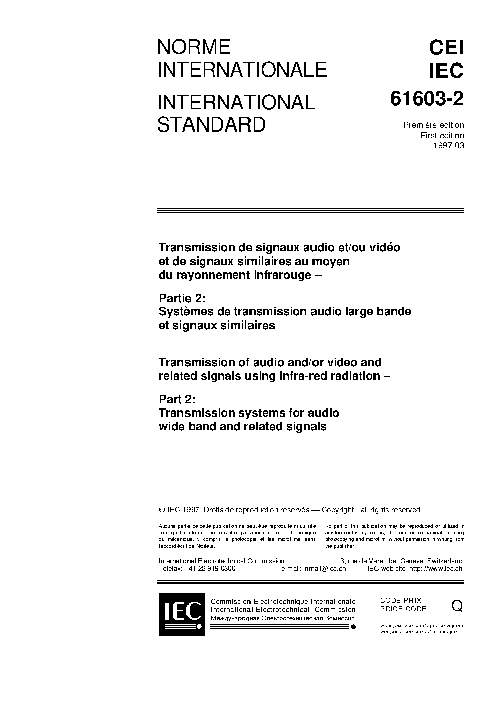 IEC 61603-2:1997/AMD1:2004 Amendment 1 - Transmission of audio and/or video and related signals using infra-red radiation - Part 2: Transmission systems for audio wide band and related signals