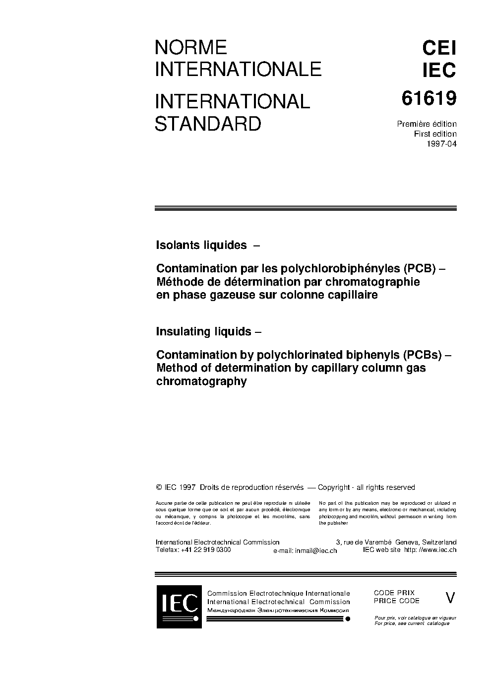 IEC 61619:1997 Insulating liquids - Contamination by polychlorinated biphenyls (PCBs) - Method of determination by capillary column gas chromatography
