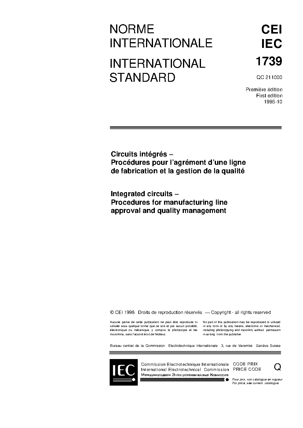 IEC 61739:1996 Integrated circuits - Part 1: Procedures for manufacturing line approval and quality management