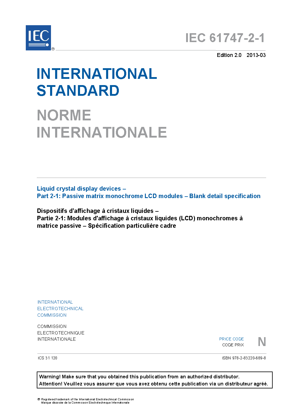 IEC 61747-2-1:2013 Liquid crystal display devices - Part 2-1: Passive matrix monochrome LCD modules - Blank detail specification