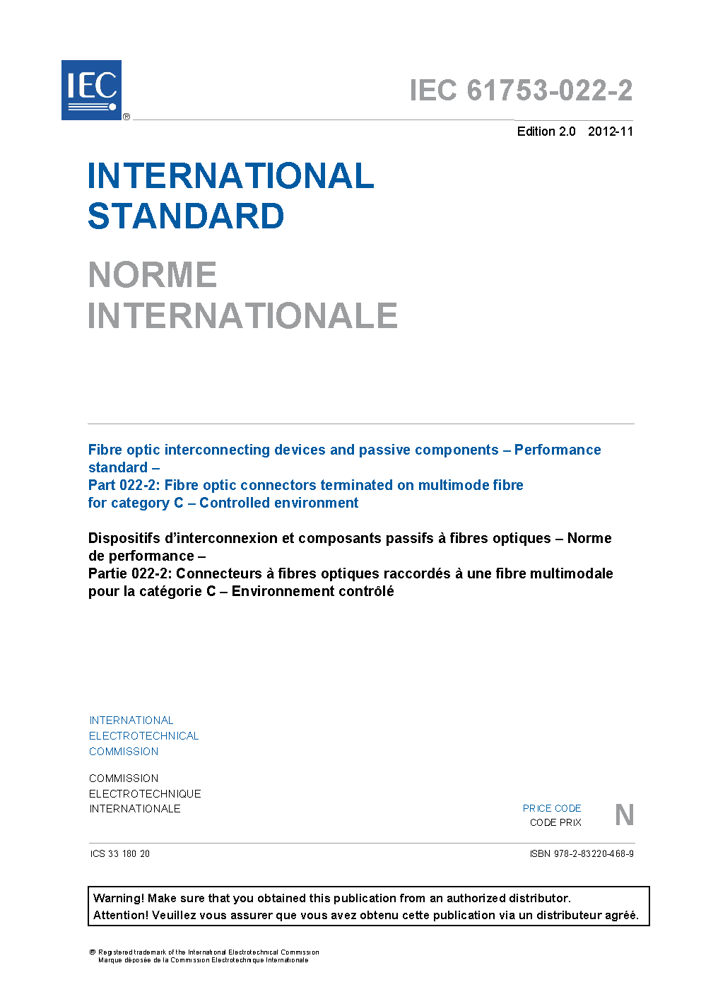 IEC 61753-022-2:2012 Fibre optic interconnecting devices and passive components - Performance standard - Part 022-2: Fibre optic connectors terminated on multimode fibre for category C - Controlled environment