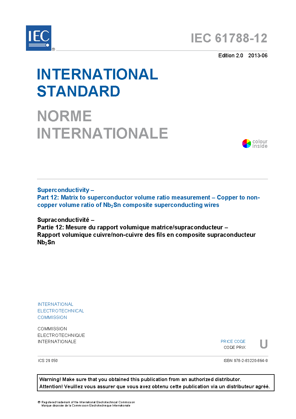 IEC 61788-12:2013 describes a test method for determining the copper to non-copper volume ratio of Cu/Nb3Sn wires. The test method given hereunder is applicable to Nb3Sn composite superconducting wires with a cross-sectional area of 0,1 mm2 to 3,0 mm2 and a copper to non-copper volume ratio of 0,1 or more. It does not make any reference to the filament diameter; however, it is not applicable to those superconducting wires with their filament, Sn, Cu-Sn alloy, barrier material and other non-copper portions dispersed in the copper matrix or those with the stabilizer dispersed. Furthermore, the copper to non-copper volume ratio can be determined on specimens before or after the Nb3Sn formation heat treatment process. The Cu/Nb3Sn wire has a monolithic structure with a round or rectangular cross-section. Though uncertainty increases, this method may be applicable to the measurement of the copper to non-copper volume ratio of the Cu/Nb3Sn wires whose cross-section and copper to non-copper volume ratio fall outside the specified ranges. This test method may be applied to other composite superconducting wires after some appropriate modifications. This second edition cancels and replaces the first edition published in 2002. It constitutes a technical revision. The main revision is the addition of two new annexes, "Uncertainty considerations" and "Uncertainty evaluation in the test method of the copper to non-copper volume ratio of Nb3Sn composite superconducting wires".