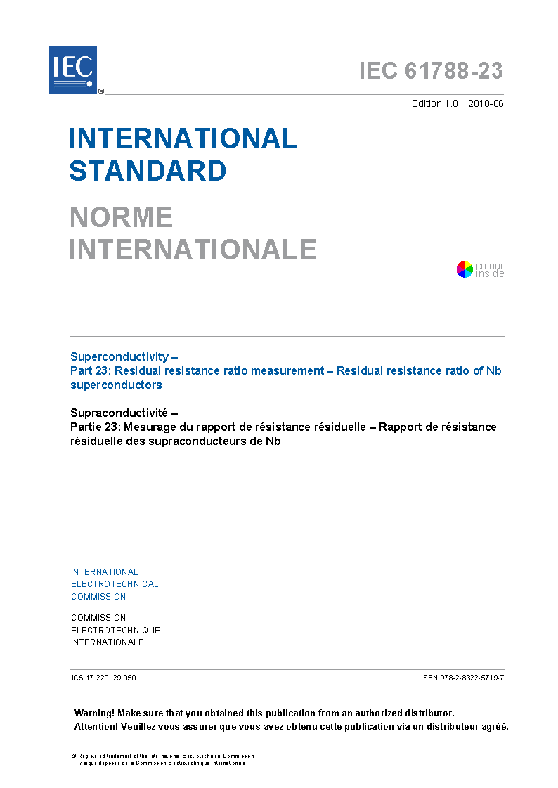 IEC 61788-23:2021 Superconductivity - Part 23: Residual resistance ratio measurement - Residual resistance ratio of cavity-grade Nb superconductors