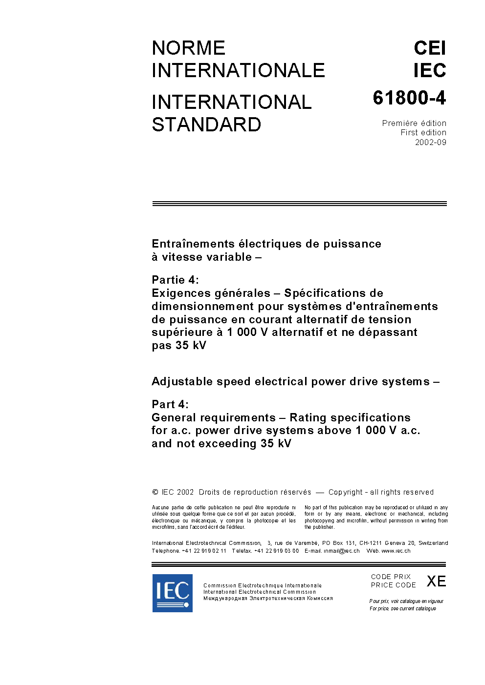 IEC 61800-4:2002 Adjustable speed electrical power drive systems - Part 4: General requirements - Rating specifications for a.c. power drive systems above 1 000 V a.c. and not exceeding 35 kV
