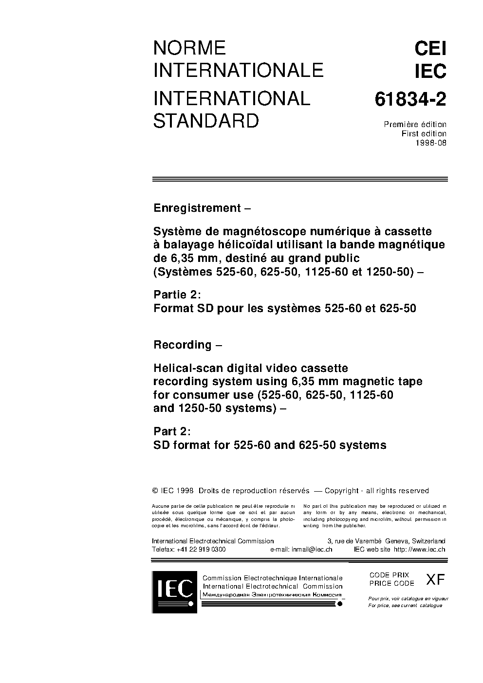 IEC 61834-2:1998 Recording - Helical-scan digital video cassette recording system using 6,35 mm magnetic tape for consumer use (525-60, 625-50, 1125-60 and 1250-50 systems) - Part 2: SD format for 525-60 and 625-50 systems