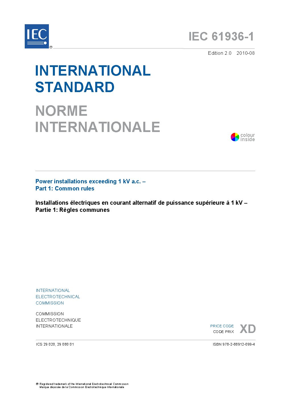 IEC 61936-1:2010 provides common rules for the design and the erection of electrical power installations in systems with nominal voltages above 1 kV a.c. and nominal frequency up to and including 60 Hz, so as to provide safety and proper functioning for the use intended. For the purpose of interpreting this standard, an electrical power installation is considered to be one of the following: