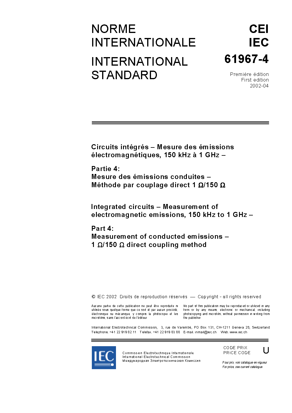 IEC 61967-4:2021 specifies a method to measure the conducted electromagnetic emission (EME) of integrated circuits by direct radio frequency (RF) current measurement with a 1 O resistive probe and RF voltage measurement using a 150 ? coupling network. These methods ensure a high degree of reproducibility and correlation of EME measurement results. This edition includes the following significant technical changes with respect to the previous edition: