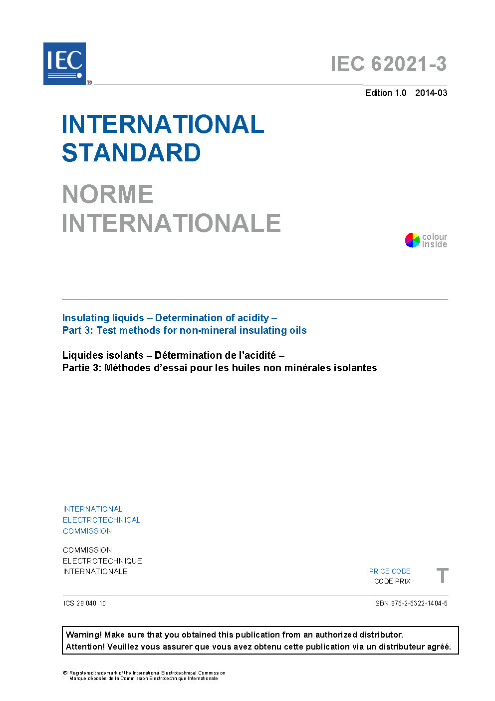 IEC 62021-3:2014 Insulating liquids - Determination of acidity - Part 3: Test methods for non-mineral insulating oils