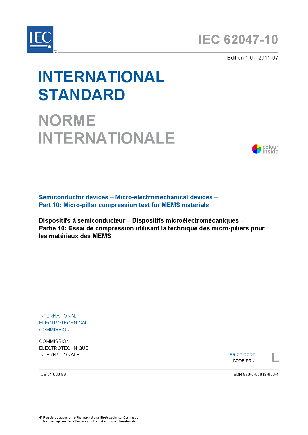 IEC 62047-10:2011 specifies micro-pillar compression test method to measure compressive properties of MEMS materials with high accuracy, repeatability, and moderate effort of specimen fabrication. The uniaxial compressive stress-strain relationship of a specimen is measured, and the compressive modulus of elasticity and yield strength can be obtained. This standard is applicable to metallic, ceramic, and polymeric materials. The contents of the corrigendum of February 2012 have been included in this copy.