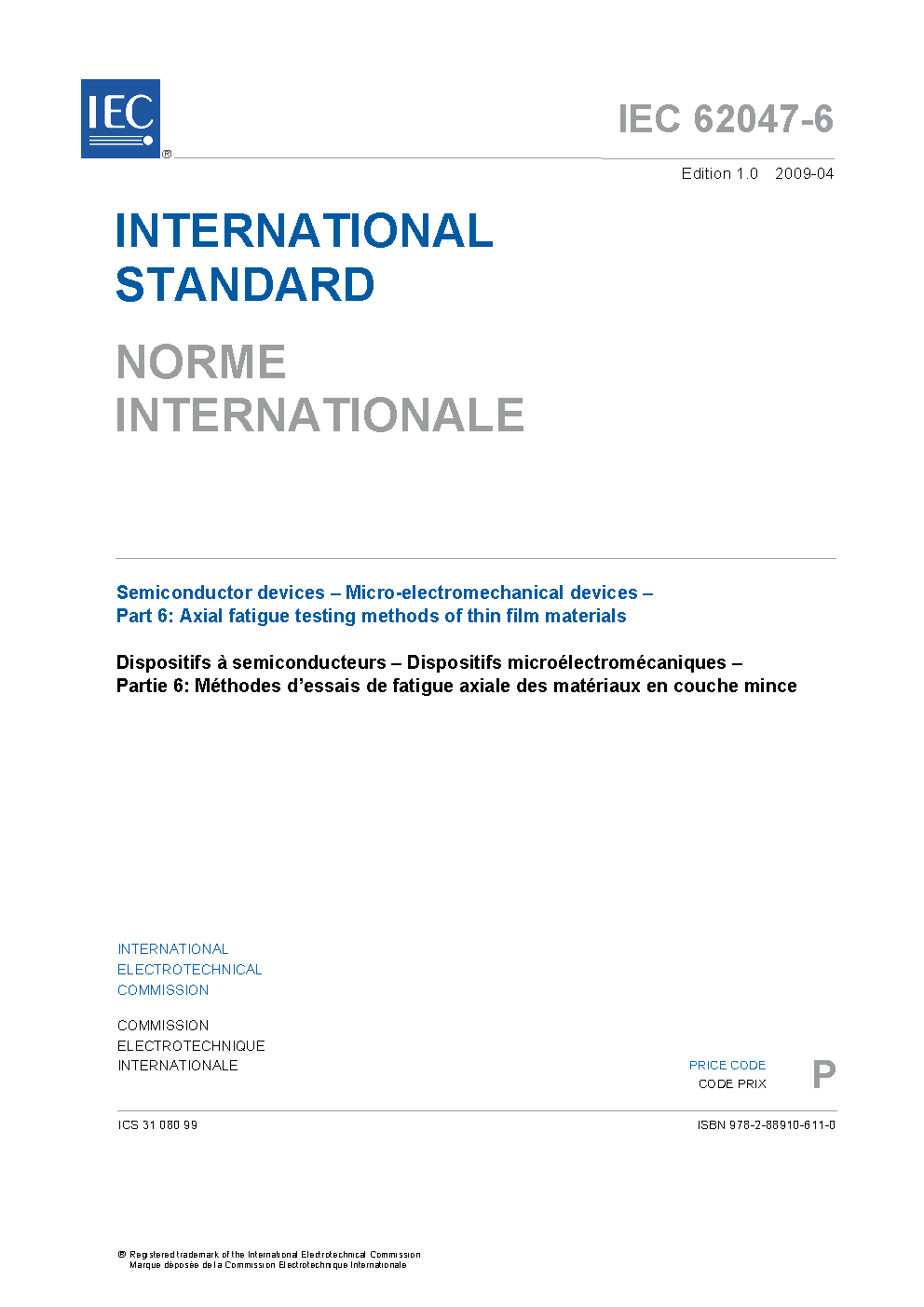IEC 62047-6:2009 specifies the method for axial tensile-tensile force fatigue testing of thin film materials with a length and width under 1 mm and a thickness in the range between 0,1 µm and 10 µm under constant force range or constant displacement range. Thin films are used as main structural materials for MEMS and micromachines. The main structural materials for MEMS, micromachines, etc., have special features, such as typical dimensions of a few microns, material fabrication by deposition, andtest piece fabrication by means of non-mechanical machining, including photolithography. This International Standard specifies the axial force fatigue testing methods for micro-sized smooth specimens, which enables a guarantee of accuracy corresponding to the special features. The tests are carried out at room temperatures, in air, with loading applied to the test piece along the longitudinal axis.