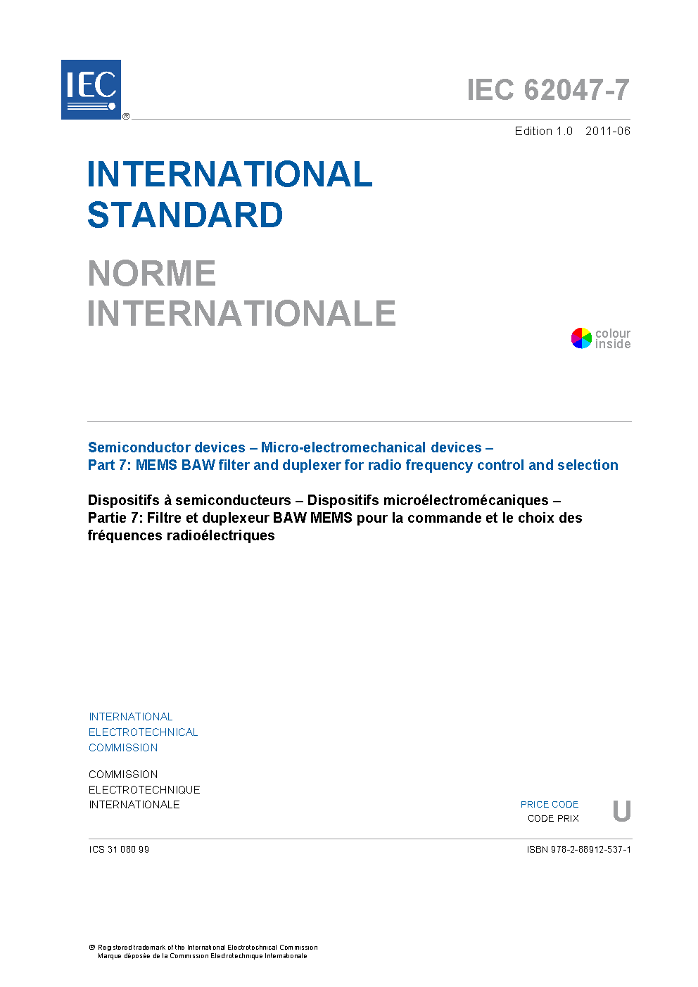 IEC 62047-7:2011 Semiconductor devices - Micro-electromechanical devices - Part 7: MEMS BAW filter and duplexer for radio frequency control and selection