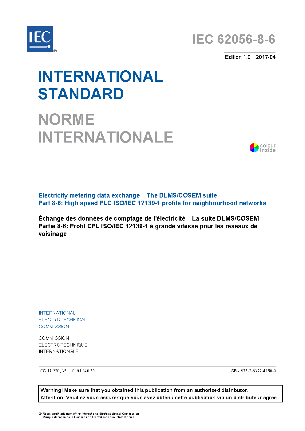 IEC 62056-8-6:2017 Electricity metering data exchange - The DLMS/COSEM suite - Part 8-6: High speed PLC ISO/IEC 12139-1 profile for neighbourhood networks