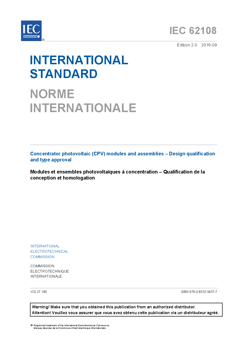 IEC 62108:2016 Concentrator photovoltaic (CPV) modules and assemblies - Design qualification and type approval