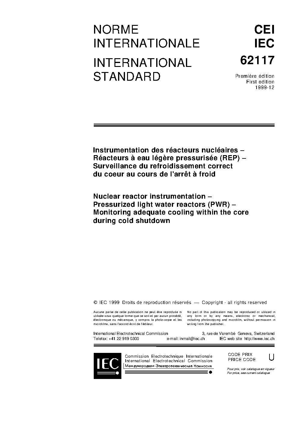 IEC 62117:1999 Nuclear reactor instrumentation - Pressurized light water reactors (PWR) - Monitoring adequate cooling within the core during cold shutdown