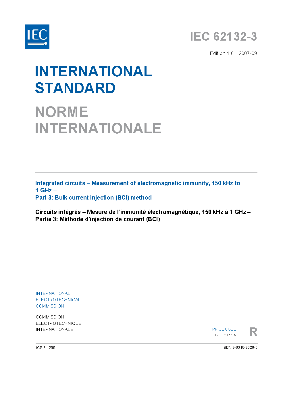 IEC 62132-3:2007 Integrated circuits - Measurement of electromagnetic immunity, 150 kHz to 1 GHz - Part 3: Bulk current injection (BCI) method