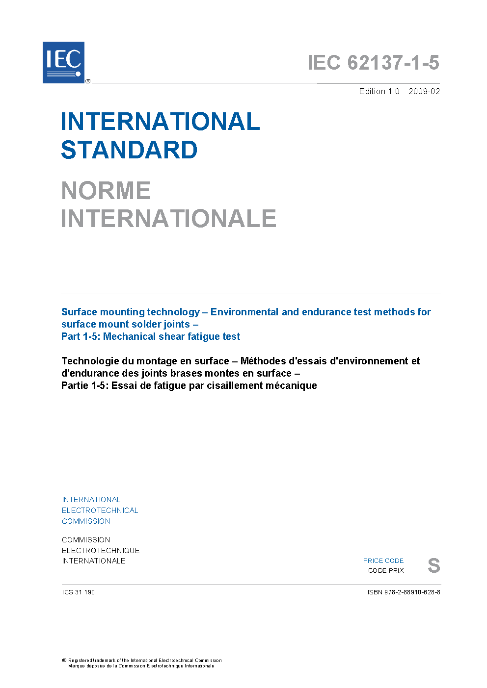 IEC 62137-1-5:2009 Surface mounting technology - Environmental and endurance test methods for surface mount solder joints - Part 1-5: Mechanical shear fatigue test