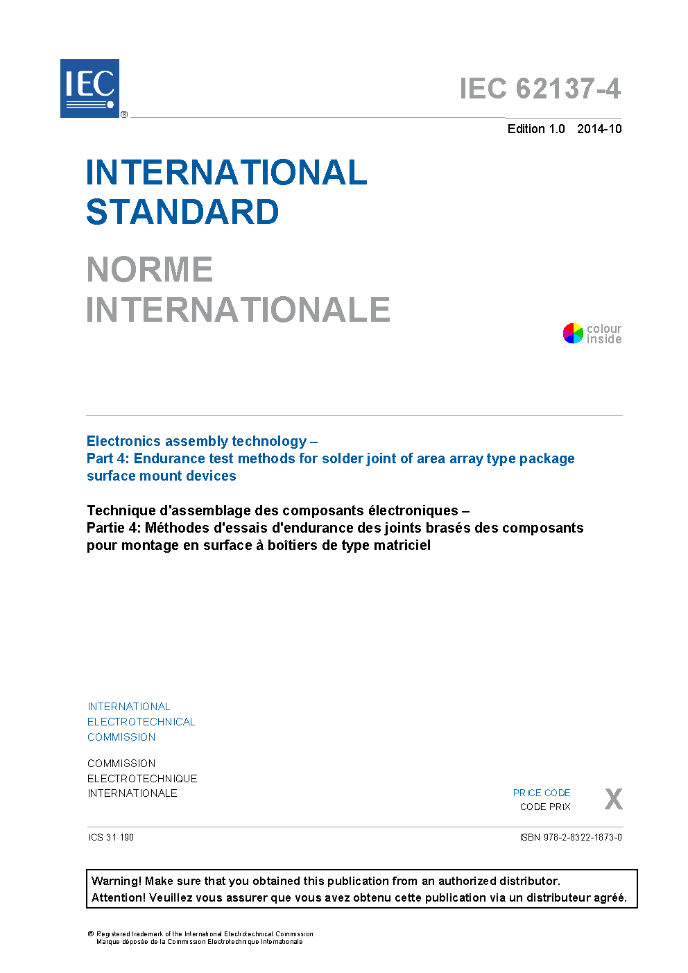 IEC 62137-4:2014 specifies the test method for the solder joints of area array type packages mounted on the printed wiring board to evaluate solder joint durability against thermo-mechanical stress. This part of IEC 62137 applies to the surface mounting semiconductor devices with area array type packages (FBGA, BGA, FLGA and LGA) including peripheral termination type packages (SON and QFN) that are intended to be used in industrial and consumer electrical or electronic equipment. IEC 62137-4 includes the following significant technical changes with respect to IEC 62137:2004: