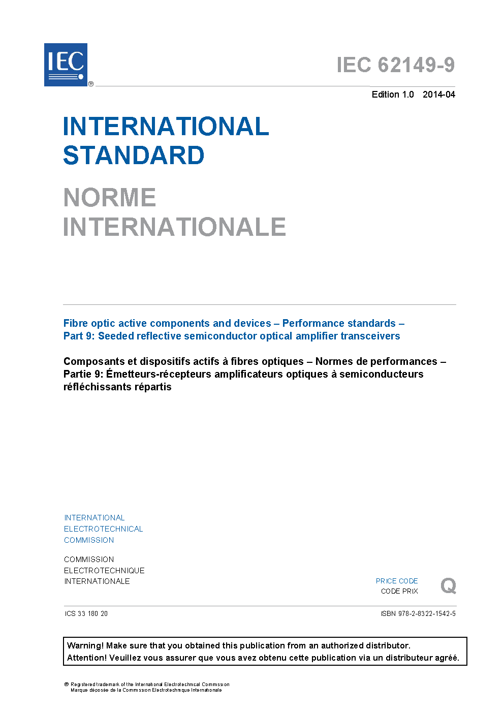 IEC 62149-9:2014 Fibre optic active components and devices - Performance standards - Part 9: Seeded reflective semiconductor optical amplifier transceivers