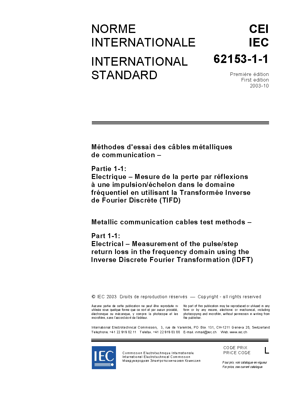 IEC 62153-1-1:2003 Metallic communication cables test methods - Part 1-1: Electrical - Measurement of the pulse/step return loss in the frequency domain using the Inverse Discrete Fourier Transformation (IDFT)