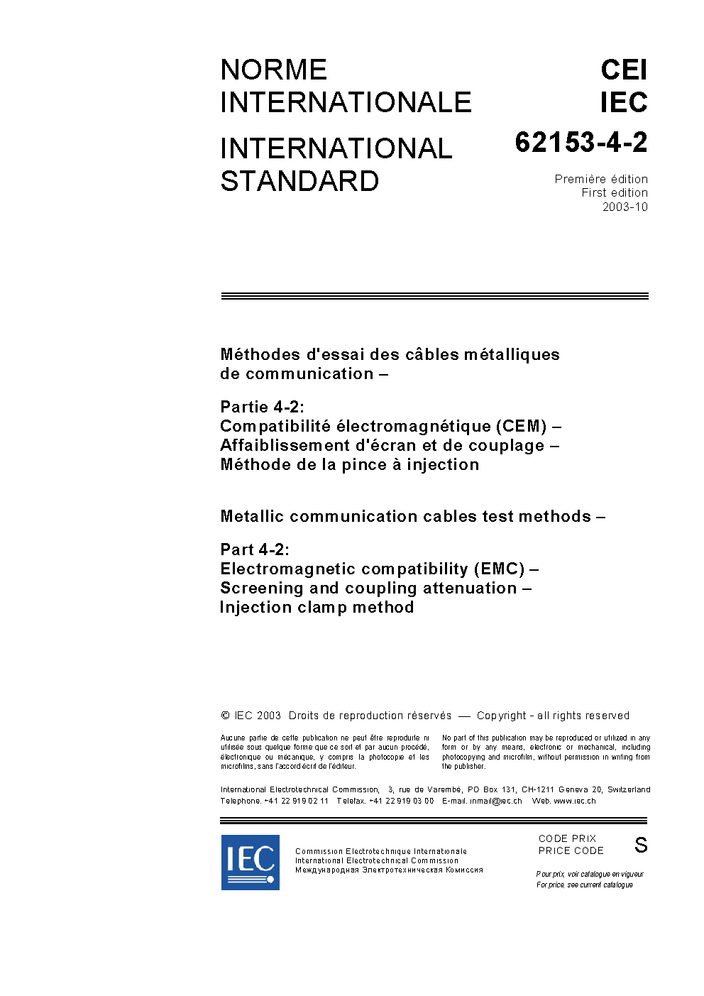IEC 62153-4-2:2003 Metallic communication cable test methods - Part 4-2: Electromagnetic compatibility (EMC) - Screening and coupling attenuation - Injection clamp method