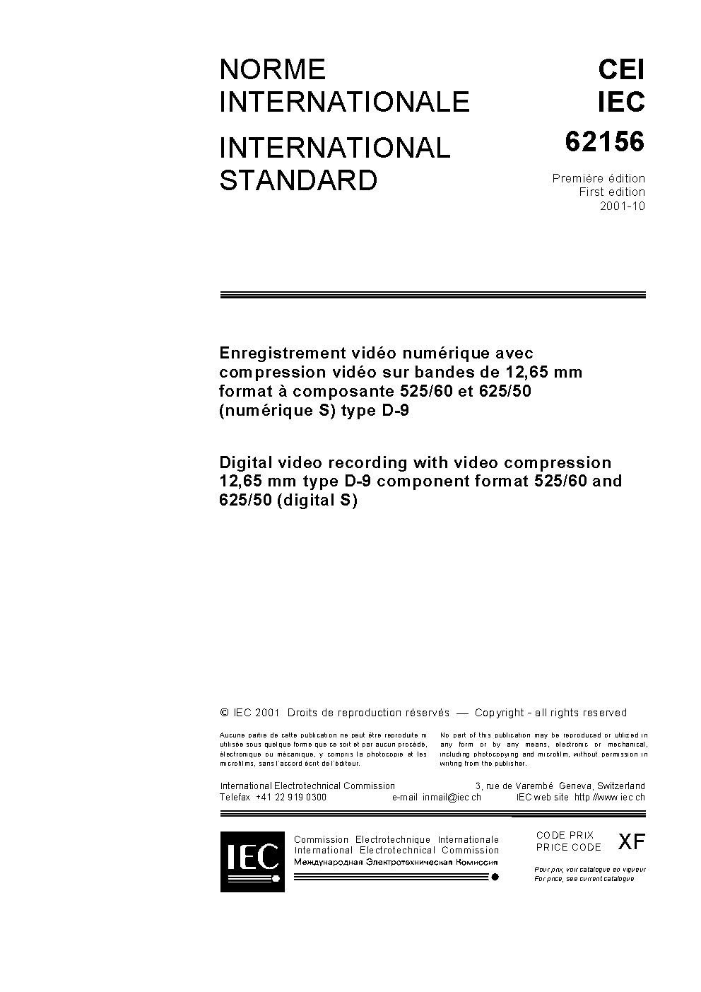 IEC 62156:2001 Digital video recording with video compression 12,65 mm type D-9 component format 525/60 and 625/50 (Digital S)