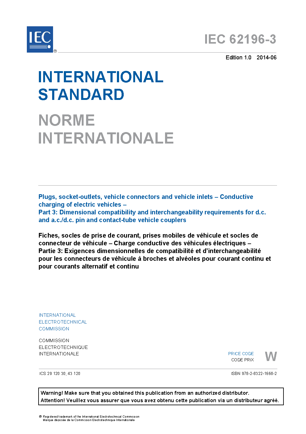 IEC 62196-3:2022 is applicable to vehicle couplers with pins and contact tubes of standardized configuration, herein also referred to as "accessories", intended for use in electric vehicle conductive charging systems which incorporate control means, with rated operating voltage and current in accordance with IEC 62196-1:2022.