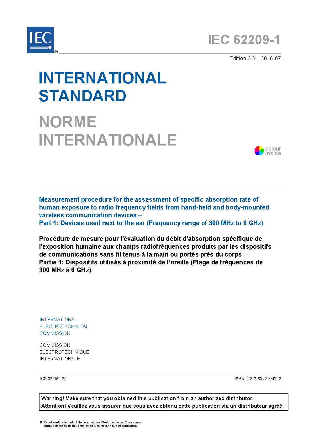 IEC 62209-1:2016 specifies protocols and test procedures for measurement of the peak spatial-average SAR induced inside a simplified model of the head with defined reproducibility. It applies to certain electromagnetic field (EMF) transmitting devices that are positioned next to the ear, where the radiating structures of the device are in close proximity to the human head, such as mobile phones, cordless phones, certain headsets, etc. These protocols and test procedures provide a conservative estimate with limited uncertainty for the peak-spatial SAR that would occur in the head for a significant majority of people during normal use of these devices. The applicable frequency range is from 300 MHz to 6 GHz. This second edition cancels and replaces the first edition published in 2005. This edition constitutes a technical revision.